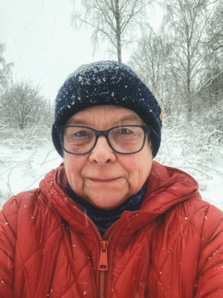 Kantstött halvt antik, ringrostig finska som bott i Sverige mer än halva livet, före detta bankkamrer, krögare, hamburgervändare, lucknucka, numera skogsmulle som håller grytan puttrande, gärna med svamp och annat ätligt ur naturens skafferi, matte till hund och dammråttor, mamma, mormor, gammelfarmor/mormor