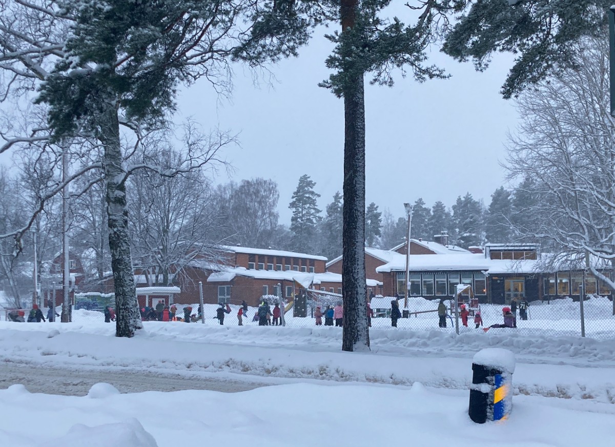 Vid skolan var det full aktivitet, man har spolat delar av skolgården och jag tror varenda unge var ute och åkte skridskor