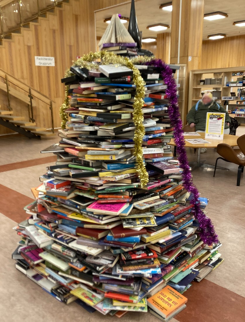 Jag hade ingen gran att slänga ut, och jag hoppas att biblanpersonalen var försiktiga när de plockade ihop sin fina bok-julgran!