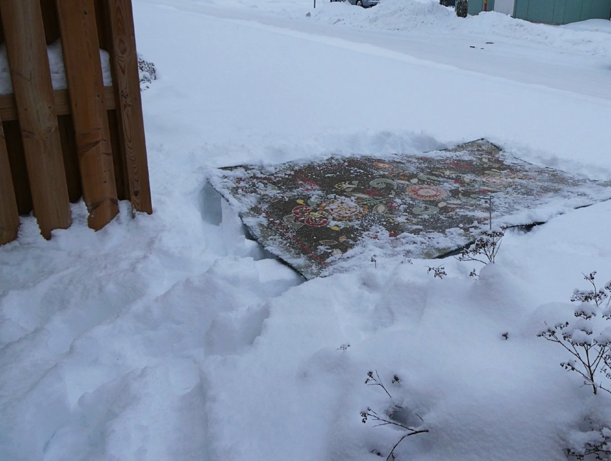 Jag har en enda matta i pörtet så det var ju snabbt gjort att hiva ut den i snön