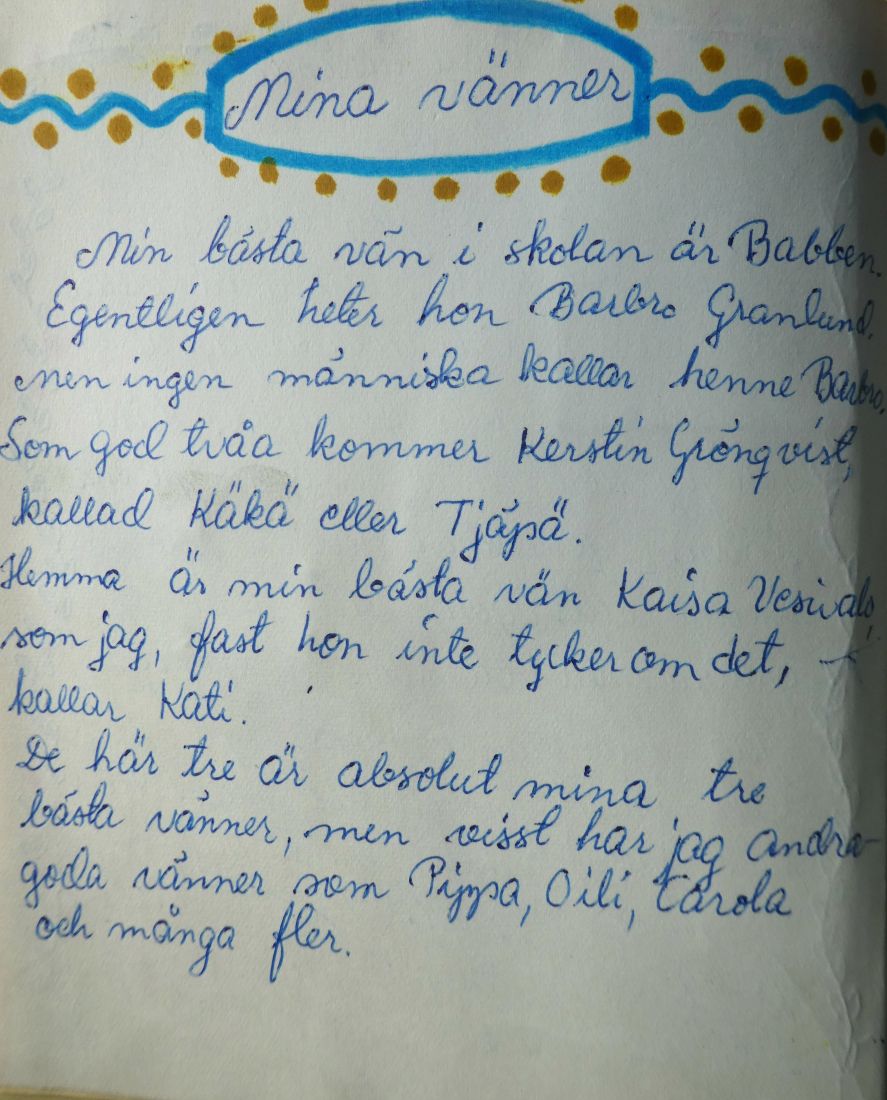 Min äldsta vän är min klasskamrat Barbro som jag träffade när jag började tredjeklass. Hon bor kvar i Finland och vi har kontakt via brev och mejl men har inte träffats sedan jag flyttade till Sverige 1978!Fotot är ur min dagbok 1968 då jag var 13