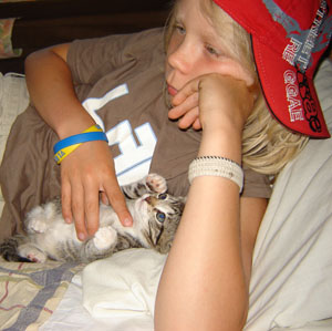 Jag har fått kärt besök, barnbarnet Simon är hos oss några dagar. Han gillar kattungarna!