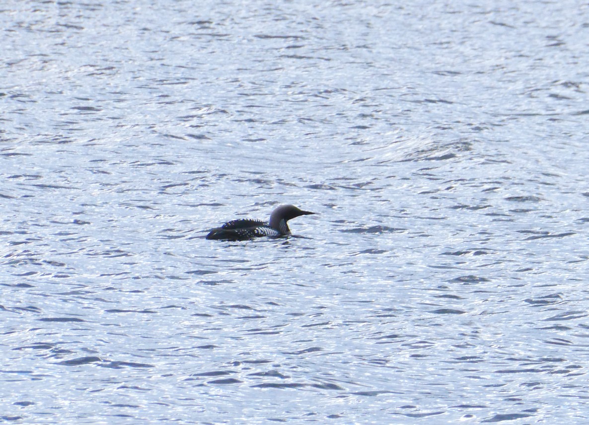 lommen var alldeles ensam långt ute på sjön i guppande vågor och var hopplöst svår att fånga med min lilla kamera. Den ligger lågt i vattnet, benen sitter långt bak på kroppen vilket är bra för dess dykförmåga men sämre för gång på land där den liksom hasar sig fram.