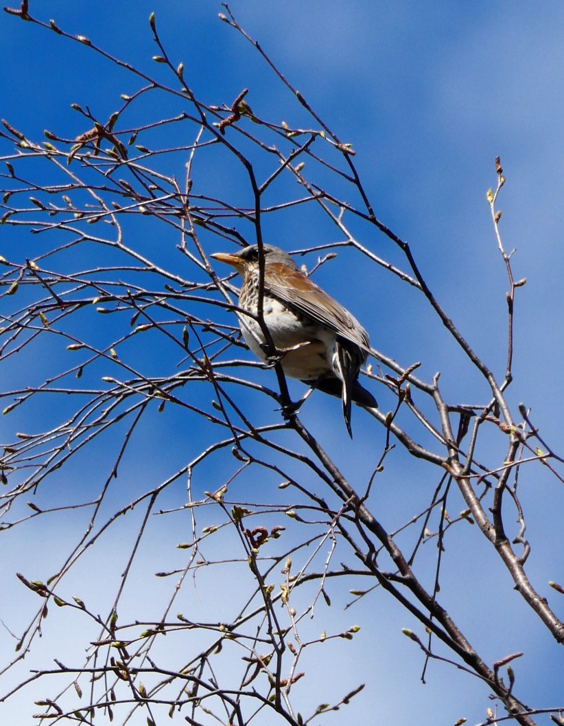 Trasten satt förstås uppe i toppen av björken och spanade in mig, men jag tror mig ändå gissa att det är en björktrast.