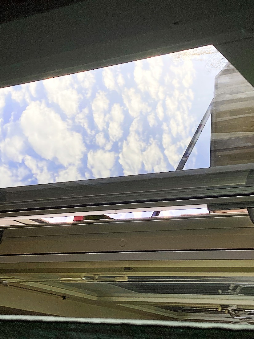 Jo detta var vad jag såg när jag öppnade mina stålgrå imorse…Jag ligger med huvudet på kudden strax intill altandörren och knäpper kort på de vita molntussarna på himlen