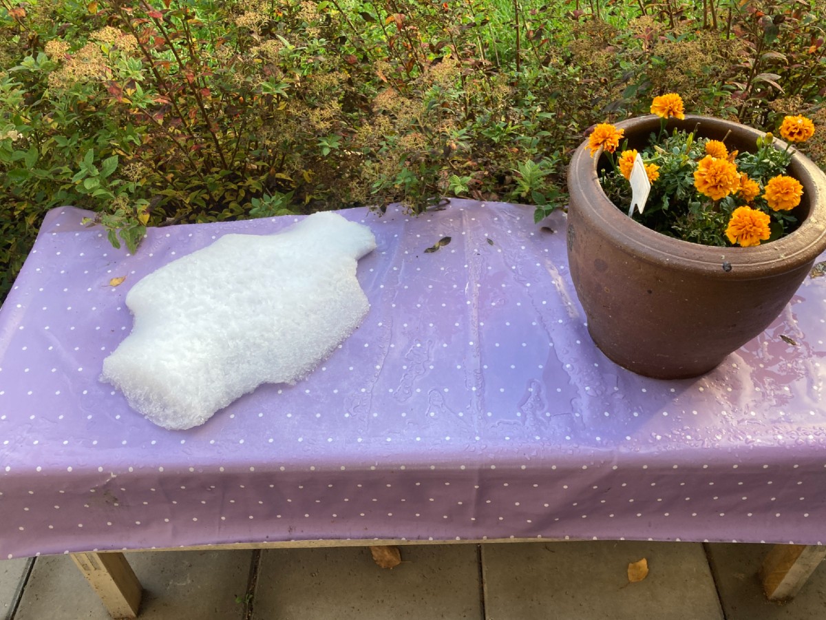 Tidig vinter i år? Eller vad är det som ligger på min bänk på uteplatsen? Jo en tjock isklump….?