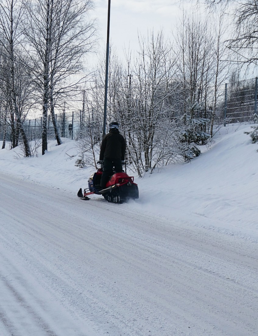 En skoter fräser förbi och lämnar spår efter sig på vägen