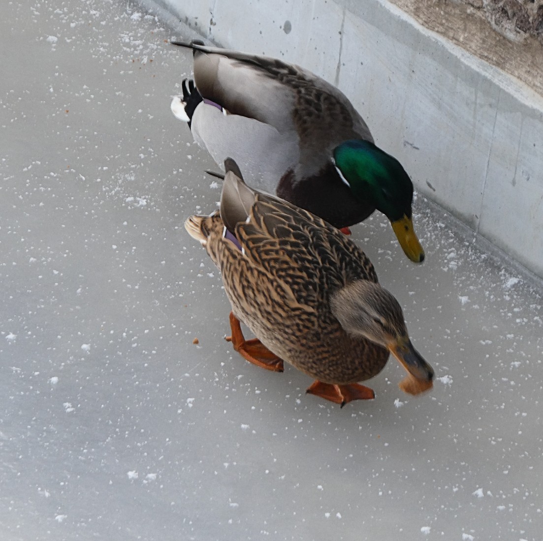 Änder har jag inte sett på hela vintern, nu fanns en hel flock i den öppna kanalen. Hanen hade upptäckt en godbit och tagit sig upp på land. Efter kom honan och vips hade hon tagit för sig, ack, så går det till även i djurens värld…