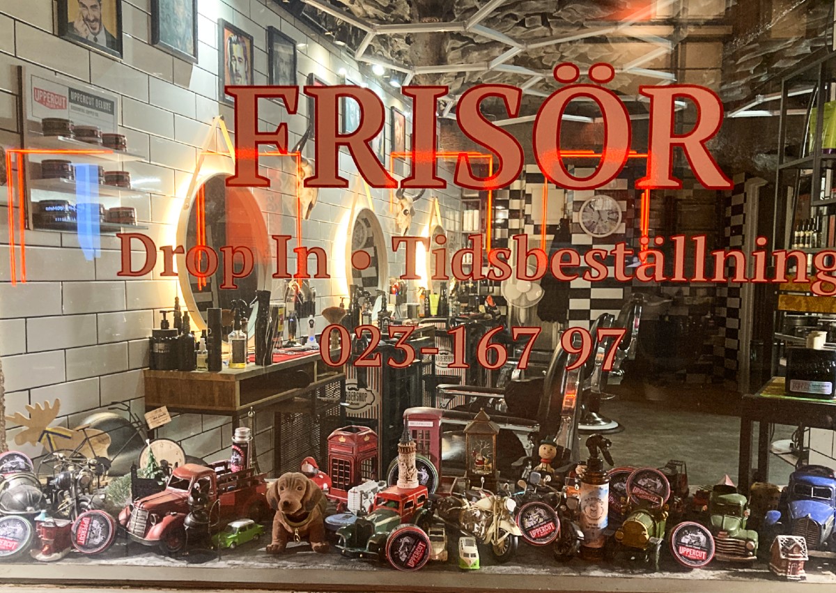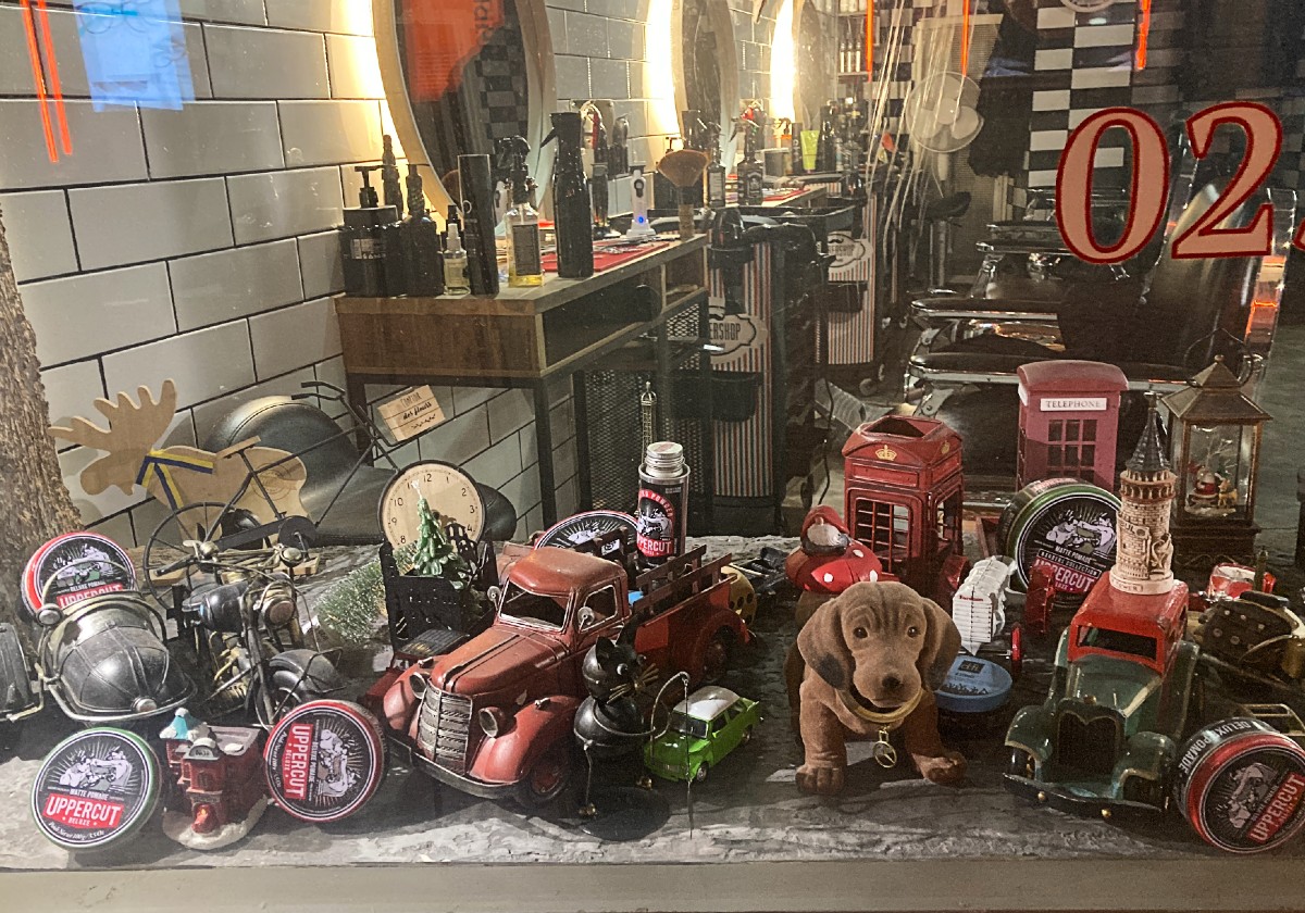 visar jag mitt favorit-skyltfönster i stan! Jag har velat fota det åtskilliga gånger men det har alltid suttit kunder i frisörstolarna men denna tidiga morgon var det ännu stängt och jag fick fota utan att störa!