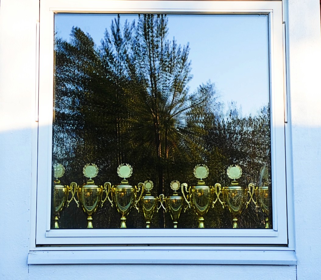 I kanotklubbens fönster skyltar man med fina pokaler