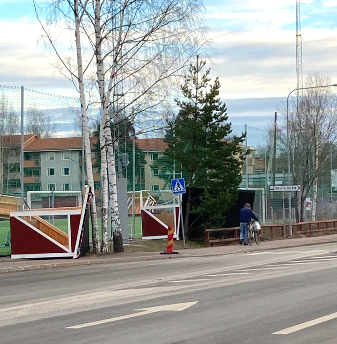 På väg till affären idag ser jag att någon lekt plockepinn på fotbollsplanen. Tror den skyldige heter Johannes…Alla avbytarbänkar har flugit och farit all världens väg..