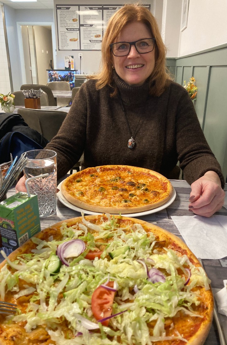 Träffade en god vän som jag inte sett på länge, vi hade mycket att prata om och missade att lunchtiden var över, tur det finns pizzerior. Väninnan valde en barnpizza, det skulle jag också ha gjort, den här var enorm!