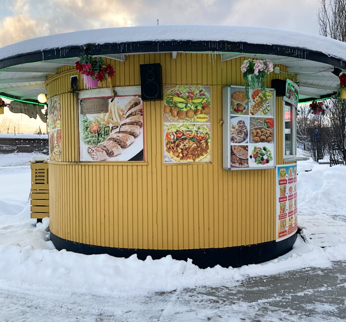Stod en dag och väntade på bussen och tittade på den solgula grillkiosken…