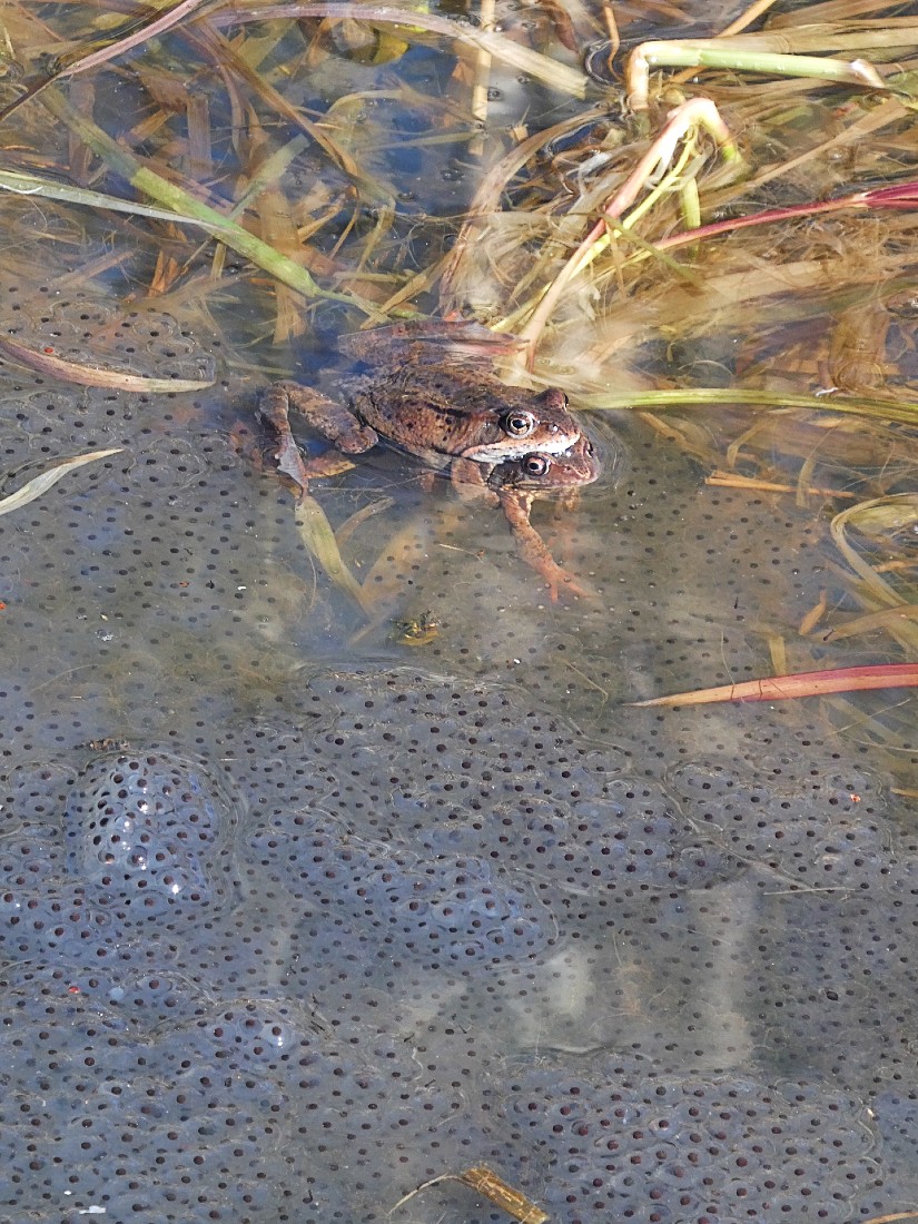 Inte förrän jag för över fotona till datorn ser jag…..grodorna in action! Nu måste jag ju komma hit flera gånger och se hur rommen blir till yngel! Naturen på våren är fantastisk!