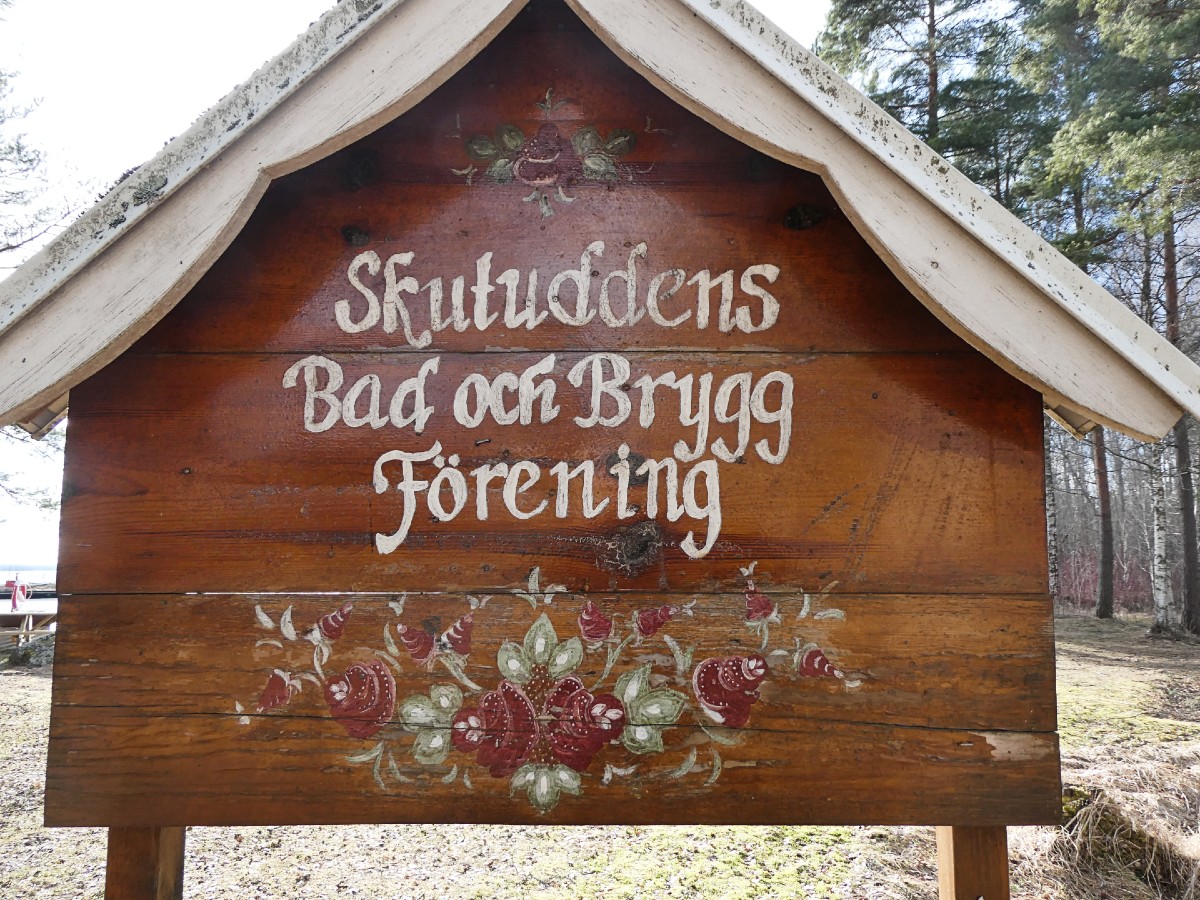 En vackert snickrad och målad skylt nere vid småbåtsbryggan